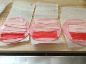 Đặt lát củ cải lớn hơn 15 cm và xếp theo thứ tự dăm bông, tía tô.
