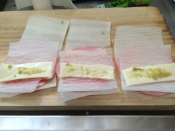 Chia phô mai đã cắt thành 3 phần bằng nhau và thoa wasabi lên.